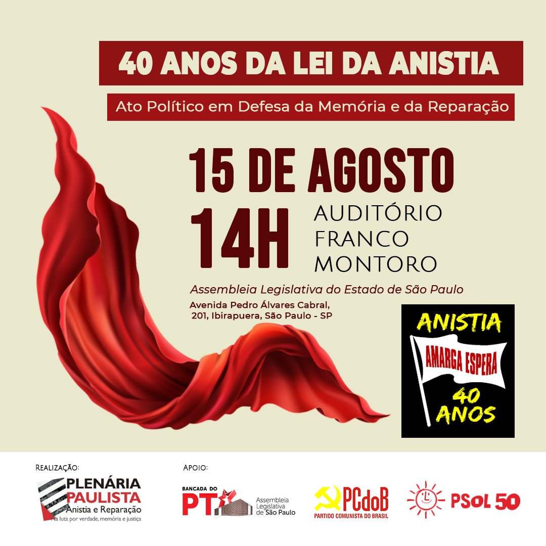 O ato político será realizado no dia 15 de agosto, às 14 horas, no auditório Franco Montoro da Assembleia Legislativa de São Paulo e, está sendo organizado pela Plenária Paulista Anistia e Reparação, formada por diversas organizações que têm como objetivo buscar a Verdade, Memória, Justiça e Reparação às vítimas da ditadura.