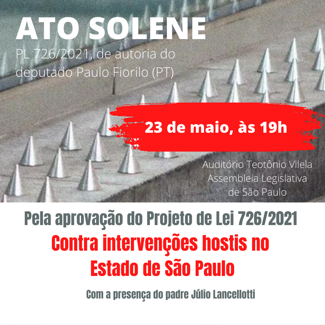 Na segunda-feira, dia 23/5, às 19h, acontece na Assembleia Legislativa de São Paulo, o ato solene proposto pelo deputado Paulo Fiorilo (PT) que vai debater a urgência da aprovação do Projeto de Lei 726/2021, conhecido como projeto padre Júlio Lancellotti.