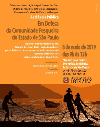 A Assembleia Legislativa de São Paulo promove no próximo dia 8/5 uma audiência pública em defesa da comunidade pesqueira do estado de São Paulo. O evento será realizado das 9h às 12h, no plenário D. Pedro I, promovido pela liderança do PT com a participação dos deputados Dr. Jorge do Carmo e Enio Tatto.