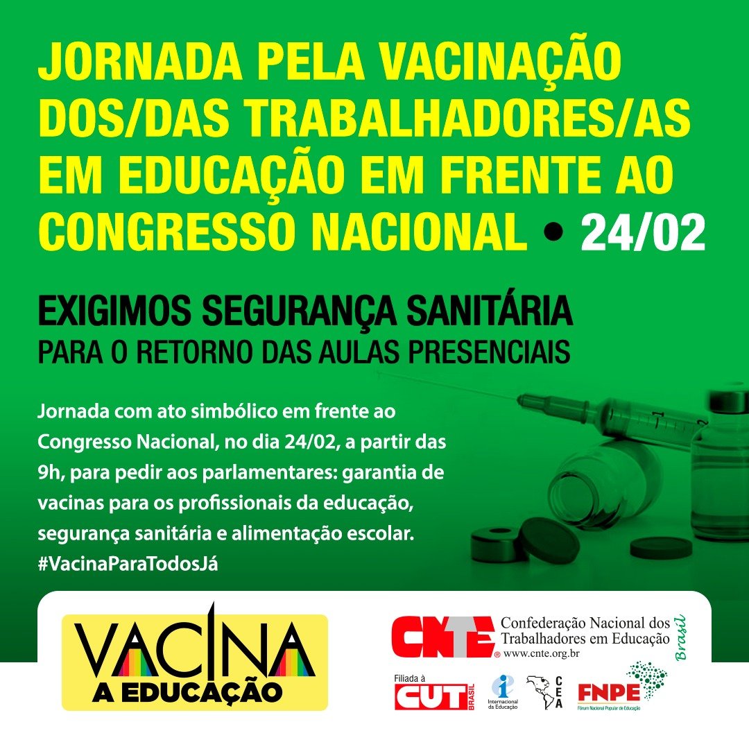 Na próxima quarta-feira (24), a Confederação Nacional dos Trabalhadores em Educação (CNTE) vai participar da “Jornada Nacional Vacina para Todos Já”, que tem o objetivo de pedir aos parlamentares vacina para todos, com prioridade aos profissionais da educação, além de segurança sanitária para as comunidades e alimentação escolar. A mobilização também exige orçamento público setorial capaz de assegurar o enfrentamento à pandemia para 2021.