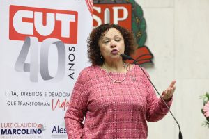 Deputas petistas com história na luta sindical, Paulo Fiorio e Teonilio Barba compuseram a mesa da sessão solene juntamente com os dirigentes da CUT Nacional, Aparecido Donizeti da Silva, secretário-geral, e Juneia Batista, secretária nacional da Mulher Trabalhadora; e com os dirigentes da CUT São Paulo, Douglas Izzo, presidente estadual da central de 2015 a 2023, e Raimundo Suzart, companheiro da categoria dos químicos, que acabou ser eleito para a presidência da entidade, gestão de 2023-2027, durante o 16º Cecut-SP, realizado no último final de semana.