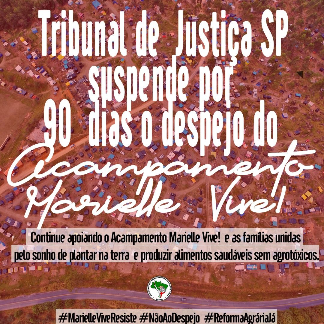 Hoje, dia 29 de agosto, o Desembargador do TJ de SP concedeu o efeito suspensivo da ação de reintegração de posse movida pela Fazenda Eldorado Empreendimentos Imobiliários onde vivem as famílias do Acampamento Marielle Vive!, no município de Valinhos/SP. No dia 12 de agosto a juíza de primeira instância, Bianca Vasconcelos, sentenciou pelo despejo das famílias que desde o dia 14 de abril de 2018 vivem na área. Em caráter de urgência, a juíza estabeleceu 15 dias úteis para saída voluntária após publicação da decisão. O prazo encerraria no dia 09 de setembro de 2019.