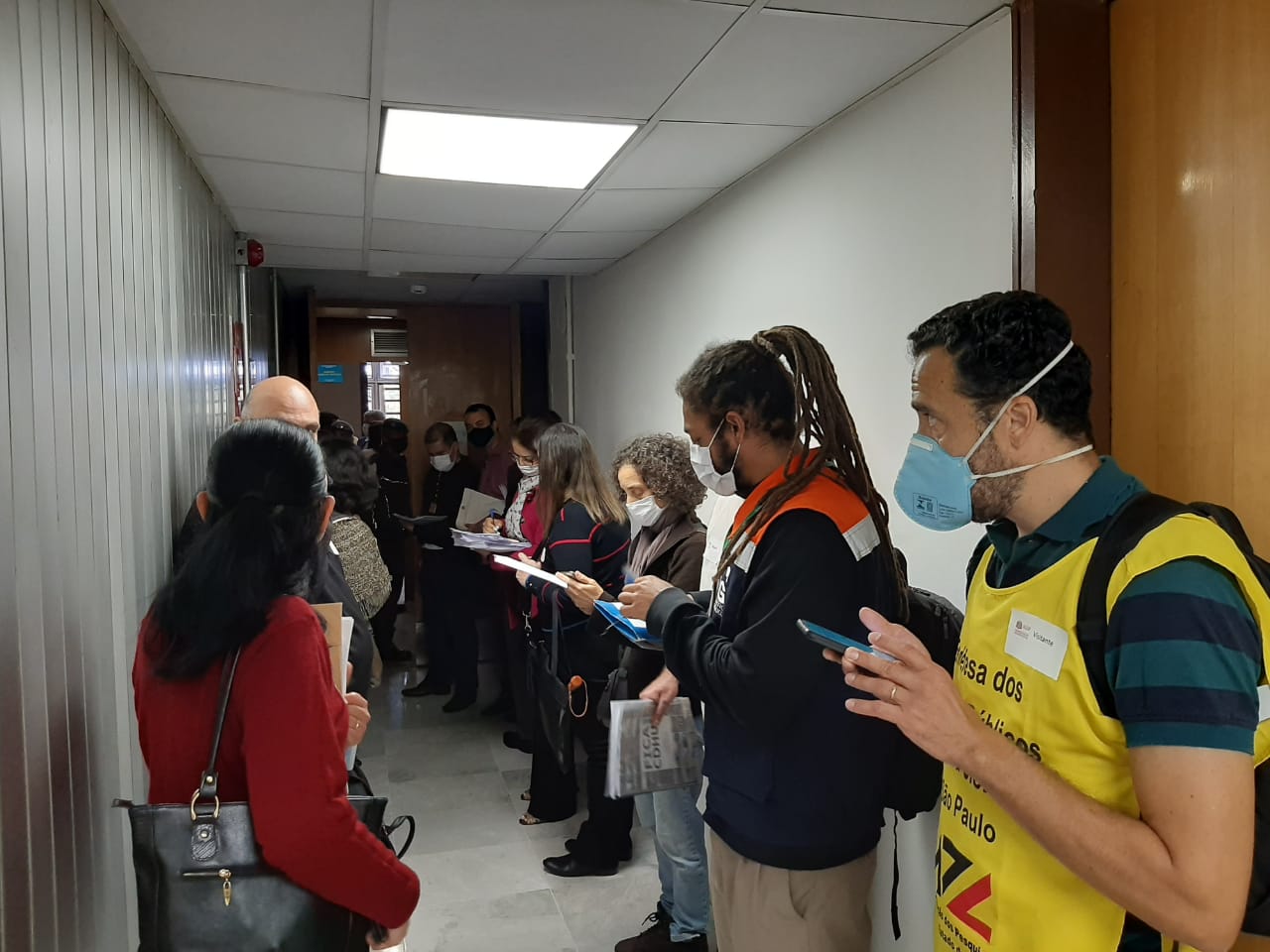 Cerca de 30 trabalhadores do Instituto de Terras do Estado de São Paulo  (Itesp), da Companhia de Desenvolvimento Habitacional e Urbano (CDHU ) e pesquisadores das universidades públicas estaduais, enfileirados, ocuparam o corredor de acesso ao auditório onde deveria acontecer a reunião. Deputados integrantes da comissão, substitutos e suplentes, eram abordados pelos funcionários das empresas ameaçadas de extinção.