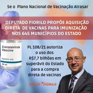 O Projeto de Lei 108/2021, apresentado pelo deputado Paulo Fiorilo, autoriza o governo do Estado a adquirir diretamente imunizantes para atender a demanda de vacinação nos 645 municípios do Estado, caso o governo federal descumpra prazos apresentados no Plano Nacional de Vacinação.