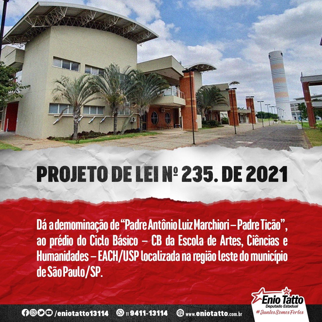 O deputado Enio Tatto (PT) apresentou o Projeto de Lei 235/2021 que denomina de Padre Antônio Luiz Marchioni – o Padre Ticão, falecido aos 68 anos de idade em janeiro de 2021, o prédio do Ciclo Básico da Escola de Artes, Ciências e Humanidades (Each/USP), na zona leste da cidade de São Paulo.