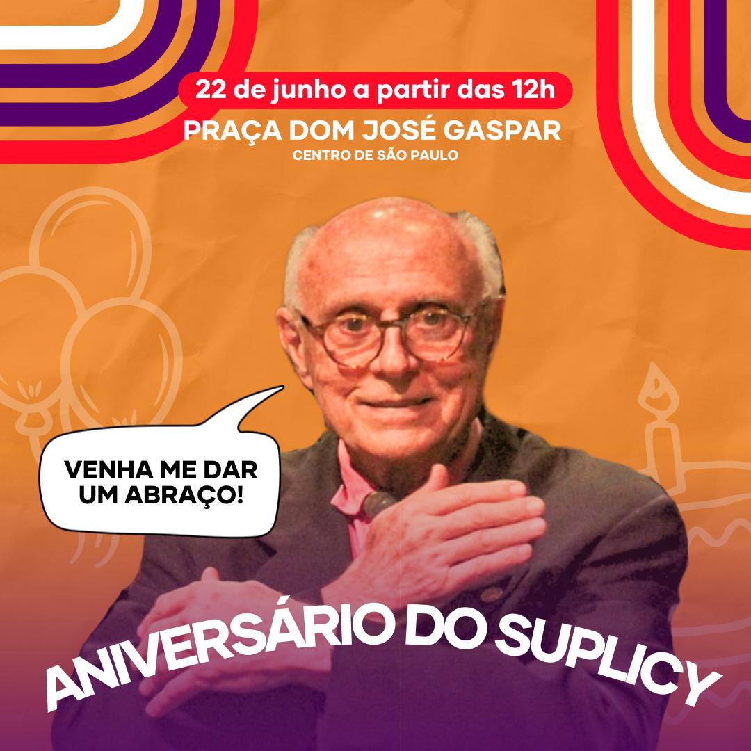 Do Facebook do deputado Eduardo Suplicy – Está chegando! Nesta sexta-feira, dia 21 de junho, completo 83 anos. E para comemorar, te espero no sábado, dia 22 de junho, a partir das 12 horas, na praça Dom José Gaspar. Traga os amigos, a família e quem mais puder para celebrar meus 83 anos com muita alegria. Não vou embora enquanto você não chegar com seu melhor presente: um abraço bem apertado!
