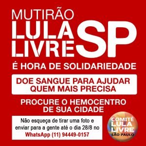 A quarta edição da versão digital do Mutirão acontece no próximo sábado, 29, às 15 horas nas redes do Comitê Nacional Lula Livre e páginas parceiras. Nesta edição, a pauta será as irregularidades da Operação Lava Jato e a necessidade do Supremo Tribunal Federal (STF) recuperar a credibilidade das entidades do judiciário com a aprovação da suspeição de Sérgio Moro. Os comitês estaduais e locais também farão atividades simbólicas, ocupando as ruas e as redes durante o Mutirão. Em São Paulo, a convocação do comitê estadual é de uma ação de solidariedade com doação de sangue no dia 28.