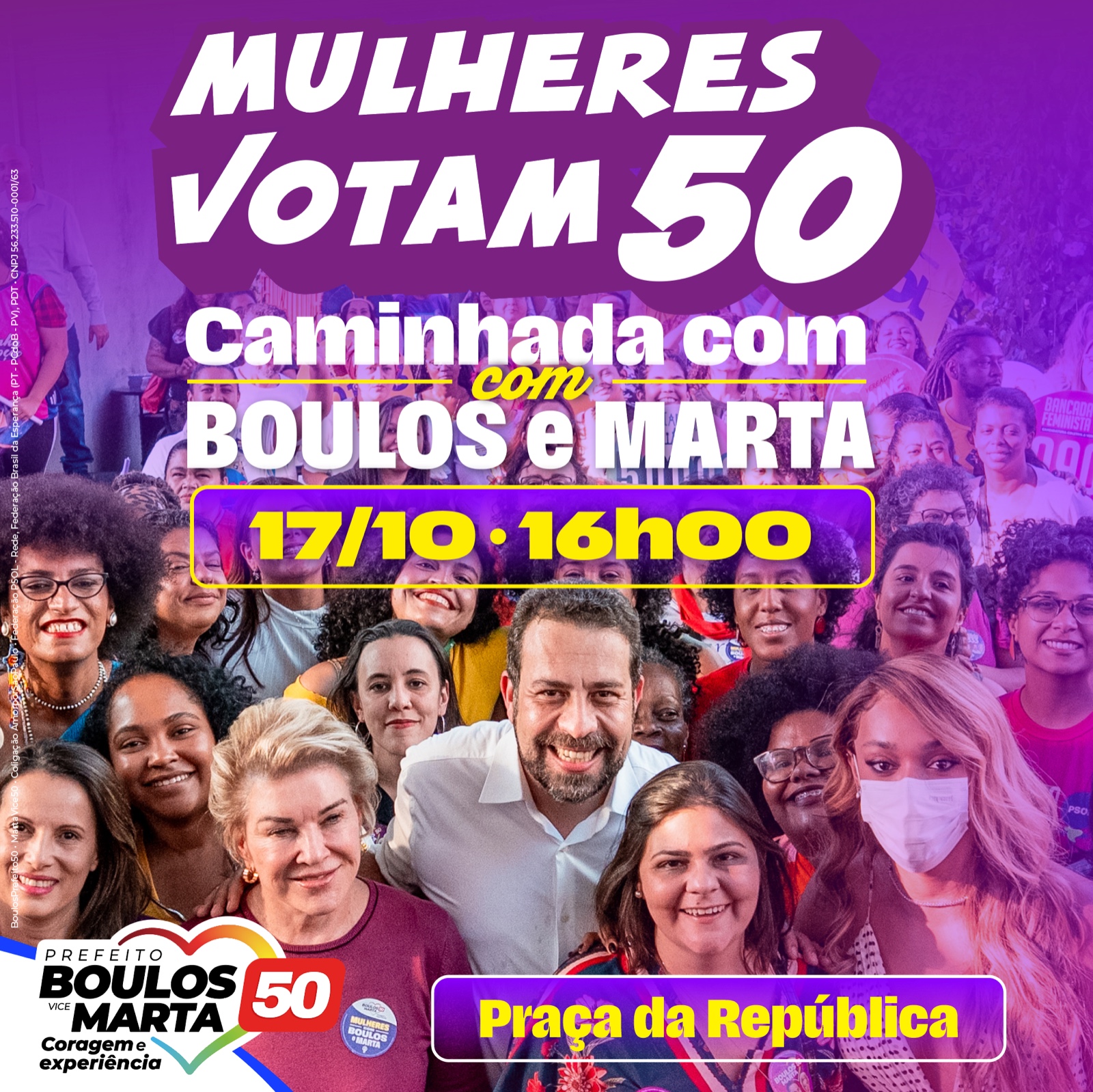 Está chegando a hora de decidir o futuro da nossa cidade. É hora da caminhada com Boulos e Marta, nesta quinta-feira, 17/10, às 16h, saindo da praça da República.