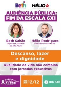 A deputada Beth Sahão (PT) e o vereador por São Paulo Hélio Rodrigues (PT) realizam nesta quinta-feira, 12/12, a audiência pública Fim da Escala 6×1. O evento será realizado no auditório Teotônio Vilela, da Assembleia Legislativa do Estado de São Paulo, a partir das 10h.