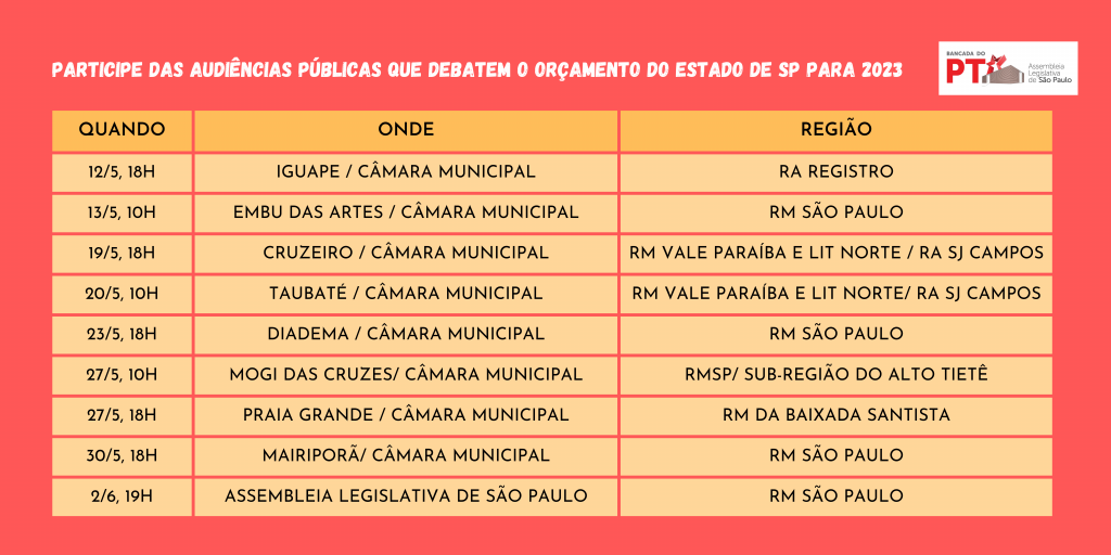Os debates acontecem até maio de 2022, em 29 cidades paulistas, e são transmitidos ao vivo pela Rede Alesp, na TV e no Youtube. Os interessados em participar, com demandas e sugestões, deverão se inscrever no site da Assembleia Legislativa.