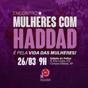 Neste sábado, 17/3, a partir das 9h, as mulheres participarão de um encontro com o ex-ministro da Educação e ex-prefeito de São Paulo, Fernando Haddad, para debater a conjuntura estadual e as políticas de igualdade de gênero. O evento acontece na cidade de São Paulo, no Galpão do Folias, à rua Ana Cintra, 213, no bairro de Campos Elíseos. No PT São Paulo.