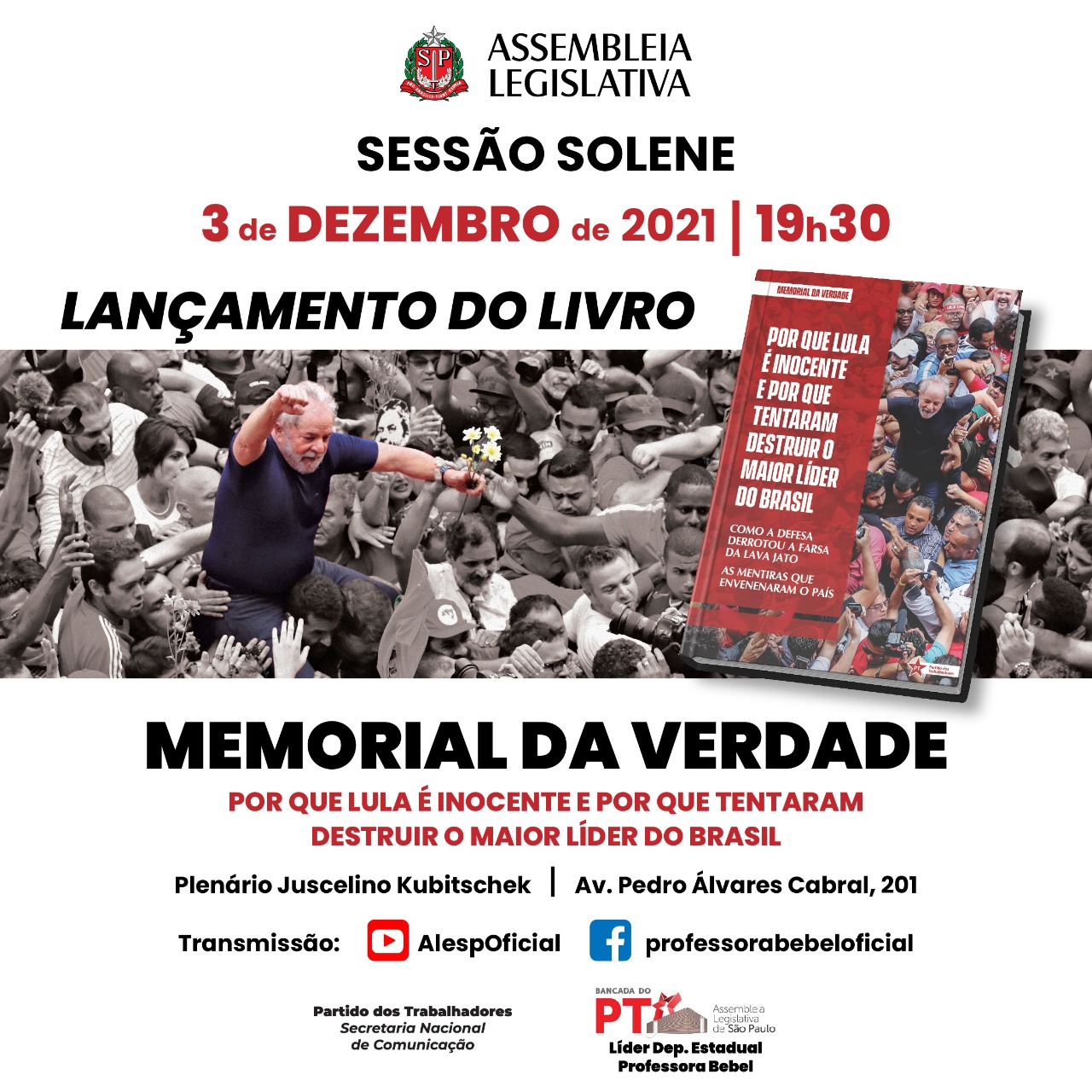 Do Facebook do PT Alesp – A líder da bancada, a deputada Professora Bebel convida a todos e todas para o lançamento do livro Memorial da Verdade, que desvenda os motivos da perseguição ao presidente Lula, culminando em uma prisão sem provas, sem crimes. A cerimônia será realizada nesta sexta-feira, 3/12, às 19h30. Venha!