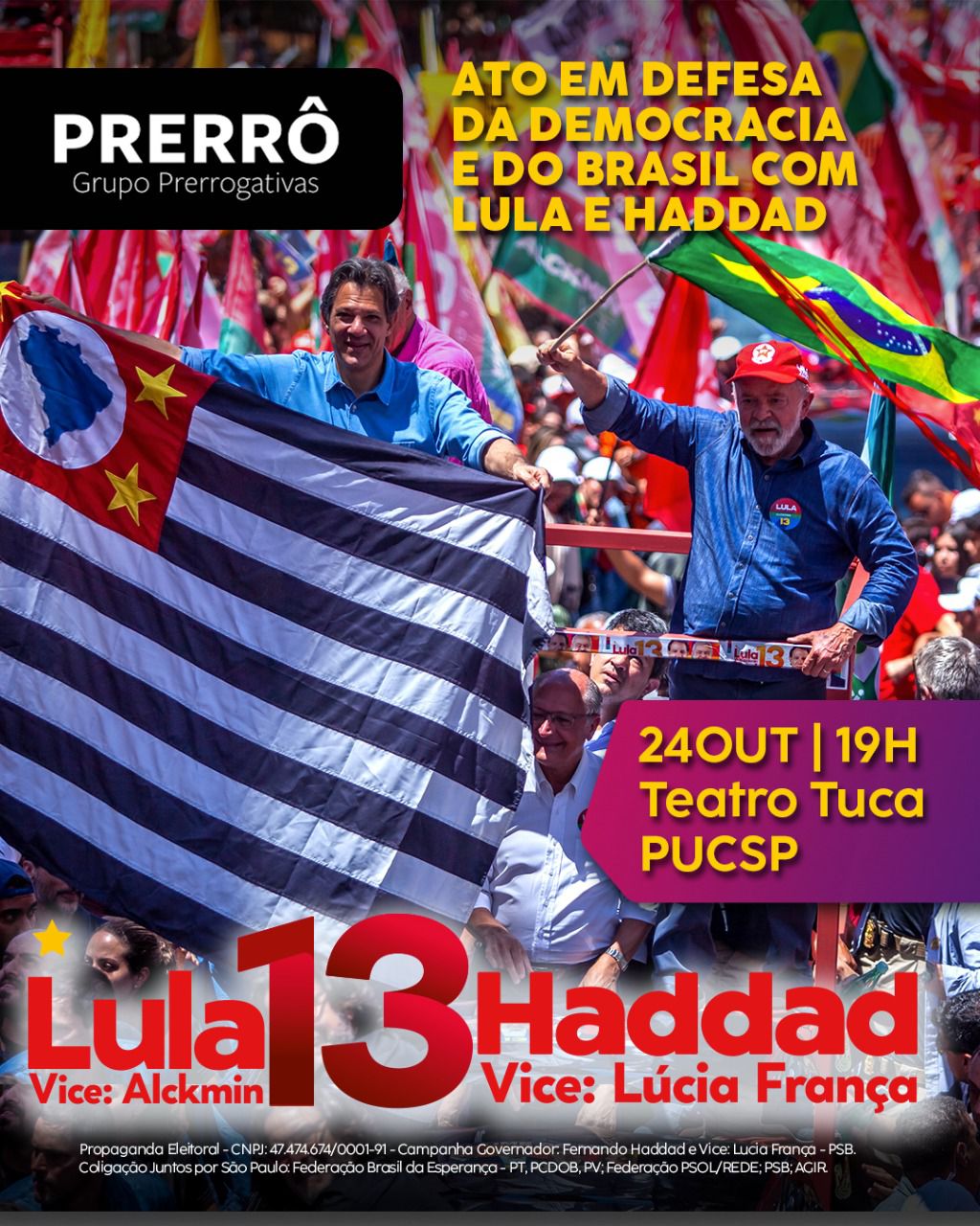 Dia 24/10, às 19h, o Movimento PUC-SP pela Democracia participa, com outros movimentos e entidades, de ato no Tuca em favor da democracia, do Brasil e das candidaturas de Lula e Haddad. Também será possível acompanhar o evento por telões instalados em frente ao teatro e por transmissão ao vivo pelo youtube da TV PUC.