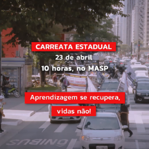 A Apeoesp convida a todas e todos para a carreata na sexta-feira, 23/4, com concentração às 10h, no Masp, na avenida Paulista, na capital do Estado. Aprendizagem se recupera, vidas não!