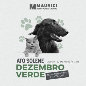 Do Facebook do deputado Maurici – Nesta quinta-feira, 22/4, às 19h, realizaremos um ato solene virtual para celebrar e discutir o Dezembro Verde, com a presença de ONGs, protetores e outros representantes da causa animal. Projeto de lei de minha autoria transformou-se em Lei 17.343/2021, que estabelece dezembro como o mês de conscientização e combate aos maus-tratos e ao abandono de animais no Estado de São Paulo.