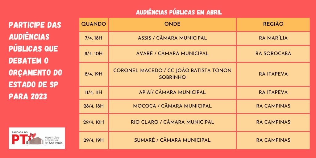 Os debates acontecem até maio de 2022, em 29 cidades paulistas, e são transmitidos ao vivo pela Rede Alesp, na TV e no Youtube. Os interessados em participar, com demandas e sugestões, deverão se inscrever no site da Assembleia Legislativa.