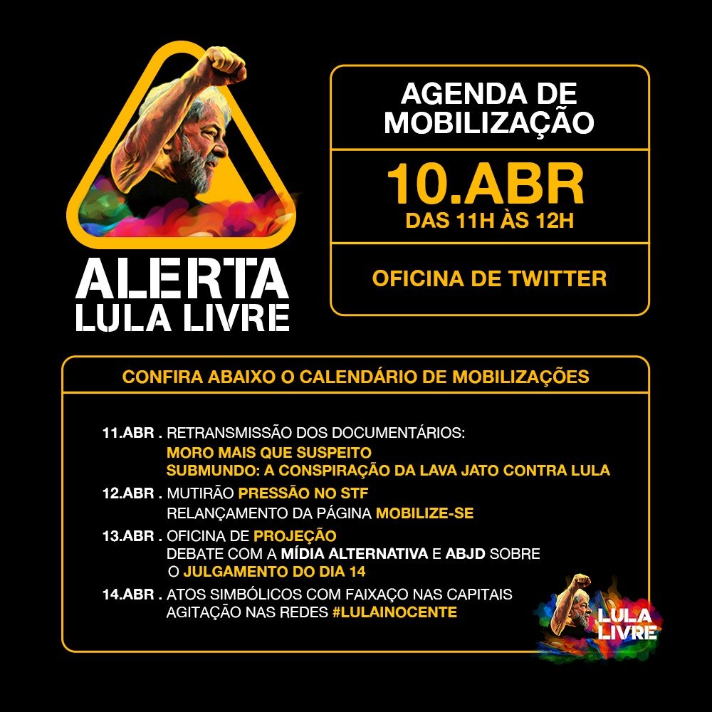 No dia 14/04, próxima quarta-feira, está marcada a sessão plenária do Supremo Tribunal Federal (STF), em que o destino das decisões recentes sobre Lula pode ser discutido. Os movimentos sociais, partidos e comitês estaduais lançam o Alerta Lula Livre, com mobilizações nas redes para manter a vigilância sobre qualquer retrocesso. No LulaLivre.
