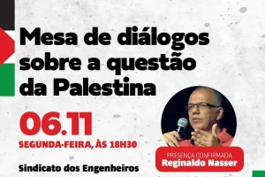 O diretório municipal do PT São Paulo promove nesta segunda-feira, 6/11, às 18h30, uma mesa de diálogos sobre a questão da Palestina. O encontro acontece no Sindicato dos Engenheiros, à rua Genebra, 25, centro da cidade de São Paulo, e tem presença confirmada de Reginaldo Nasser que é professor livre-docente na área de relações internacionais da PUC-SP, no programa de pós-graduação San Tiago Dantas (Unesp, Unicamp e PUC-SP), e coordenador do Grupo de Estudos sobre Conflitos Internacionais. No PT São Paulo.