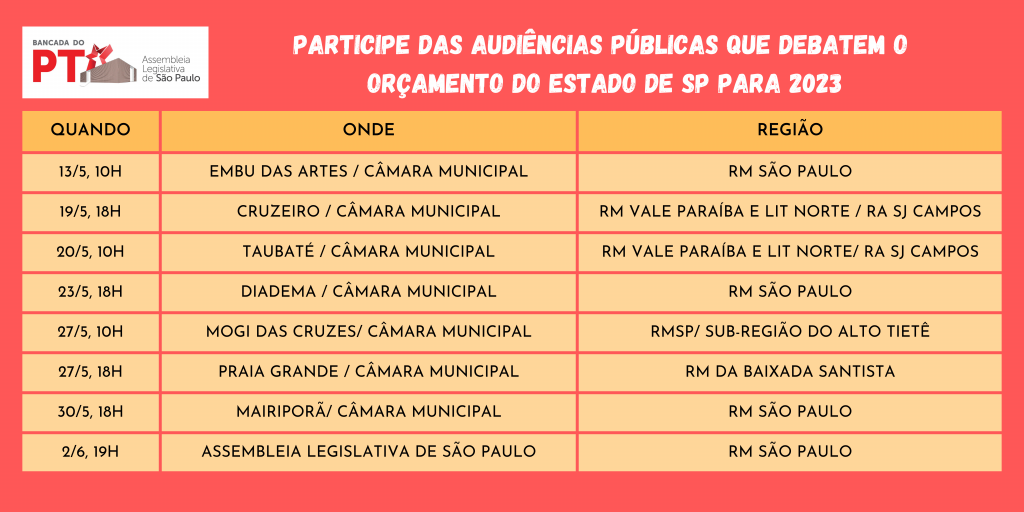 Os debates acontecem até maio de 2022, em 29 cidades paulistas, e são transmitidos ao vivo pela Rede Alesp, na TV e no Youtube. Os interessados em participar, com demandas e sugestões, deverão se inscrever no site da Assembleia Legislativa.