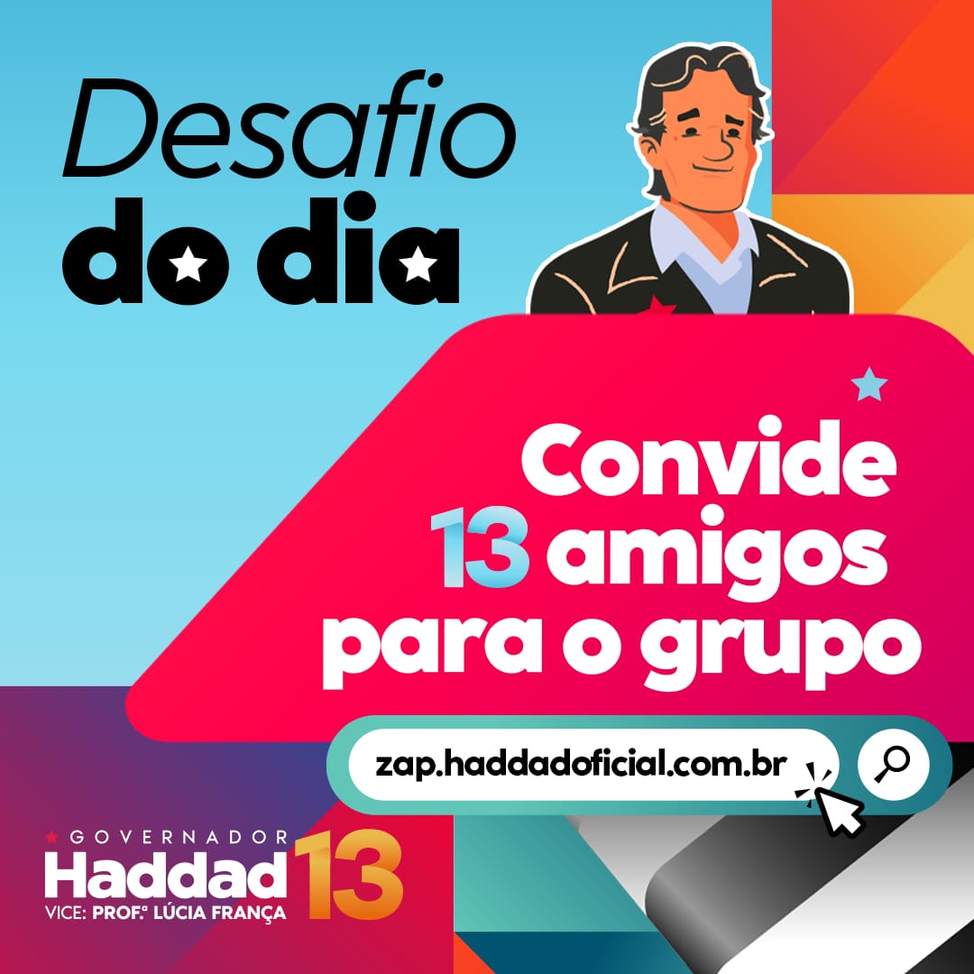 Temos pouco tempo para mostrar que Haddad está pronto e é o melhor para SP. Sua participação é essencial. O primeiro desafio é convidar 13 amigos para entrar HaddadZap.