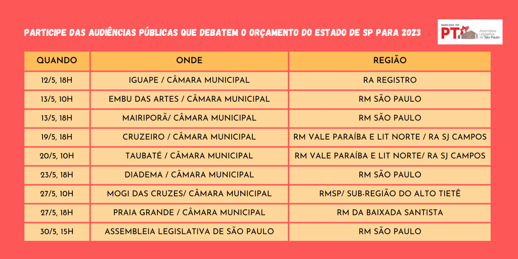 Os debates acontecem até maio de 2022, em 29 cidades paulistas, e são transmitidos ao vivo pela Rede Alesp, na TV e no Youtube. Os interessados em participar, com demandas e sugestões, deverão se inscrever no site da Assembleia Legislativa.