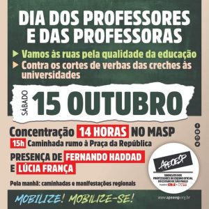 Em vídeo, a deputada e presidenta da Apeoesp, Professora Bebel, convida para caminhada com Fernando Haddad, nosso candidato a governador de São Paulo, que acontece no próximo sábado, 15/10, dia do professor. ” É momento de demonstrar apoio a esse professor que já fez muito pelo Brasil e pode fazer ainda mais por São Paulo”. Assista.