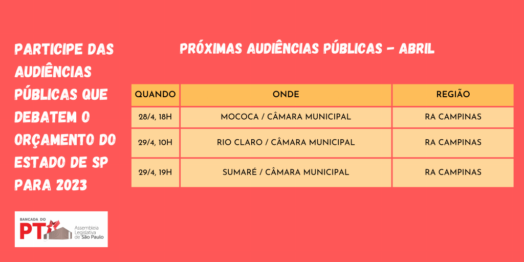 Os debates acontecem até maio de 2022, em 29 cidades paulistas, e são transmitidos ao vivo pela Rede Alesp, na TV e no Youtube. Os interessados em participar, com demandas e sugestões, deverão se inscrever no site da Assembleia Legislativa.