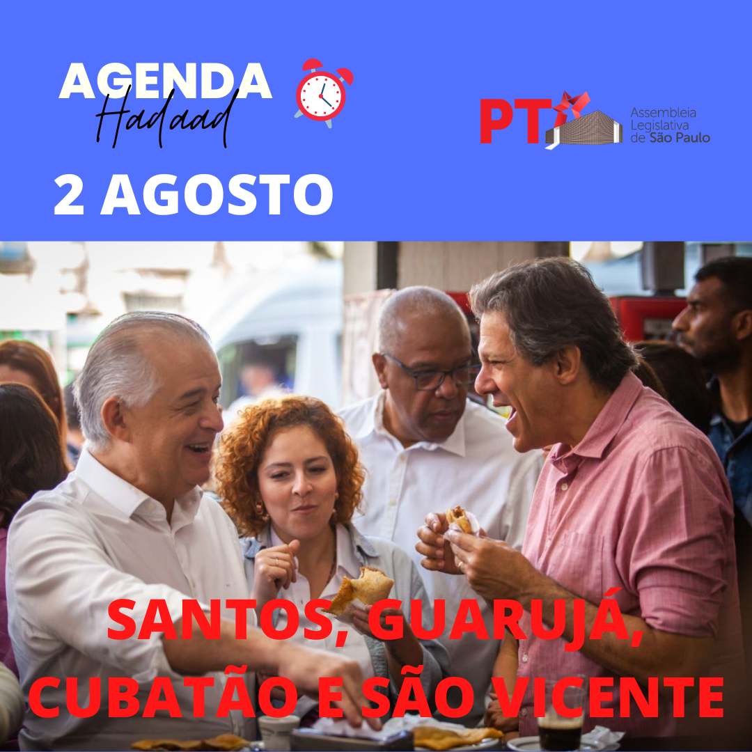 A agenda do pré-candidato do PT, Fernando Haddad, na Baixada Santista, nesta terça-feira, 2/8, começou pela manhã em Santos e tem ato final em São Vicente, com Márcio França e Geraldo Alckmin.