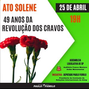 O deputado Paulo Fiorilo convida a todas e todos para o Ato Solene em homenagem à Revolução dos Cravos, símbolo da luta pela democracia restabelecida em Portugal, no ano de 1974, e que se tornou referência para a luta democrática também aqui no Brasil e no mundo. Com a presença do cônsul de Portugal, da cônsul de Angola, de representantes da Casa de Portugal, do Movimento 25 de abril, de pesquisadores e convidados, vamos mais uma vez recordar a Revolução dos Cravos e dizer em alto e bom som que Ditadura Nunca Mais, Democracia Sempre.